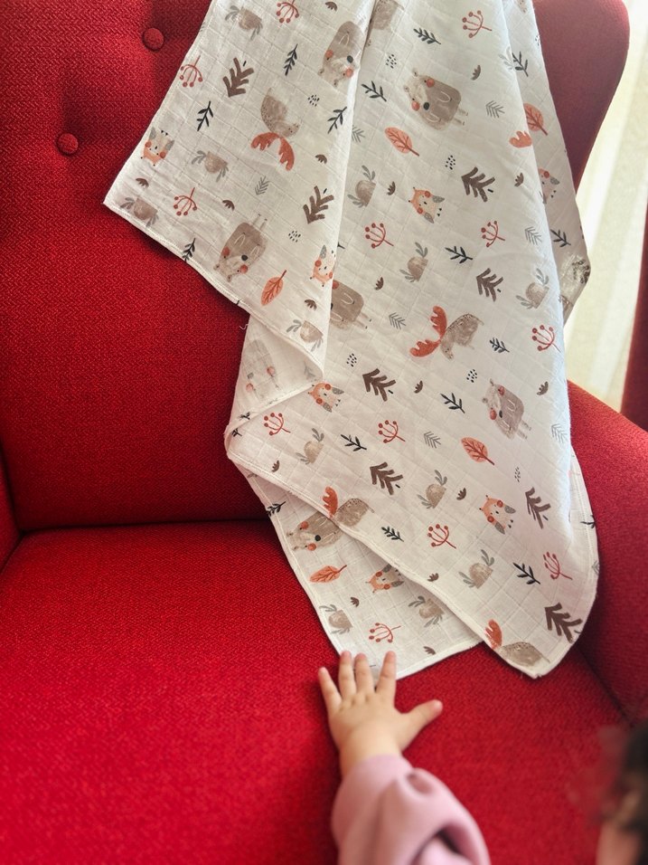 Pamuklu, müslin renkli ve desenli çocuk battaniyesi, yumuşak ve rahat yapısıyla konfor sağlar. Yazlık.