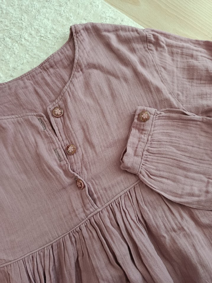 Bej renk, düğmeli hamile bluzu, yumuşak keten kumaştan, yuvarlak yaka, uzun kollu ve bol kesim. Uzun boy ve pastel tonlarda, vintage bohem tarzında, günlük kullanıma uygun.