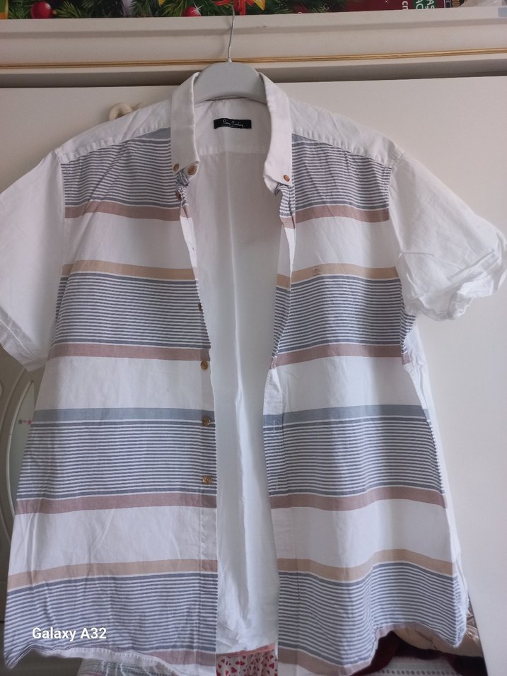 Pamuklu, düğmeli ve kısa kollu erkek gömleği. Gri ve bej çizgili deseniyle rahat ve salaş kesim, günlük sokak tarzı için uygundur.