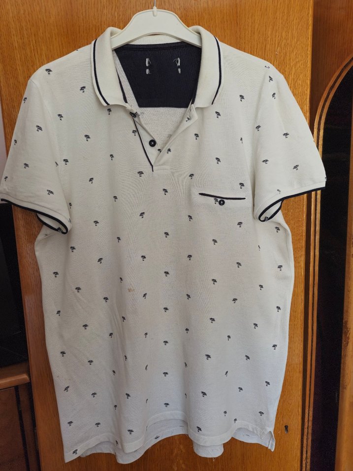 Erkekler için pamuklu, düğmeli polo tişört. Beyaz zemin üzerine lacivert baskılı desenlerle, kısa kollu ve yakalıdır. Günlük rahat kullanıma uygundur. Küçük bir lekesi var, başka defosu yoktur. M beden uyumludur.