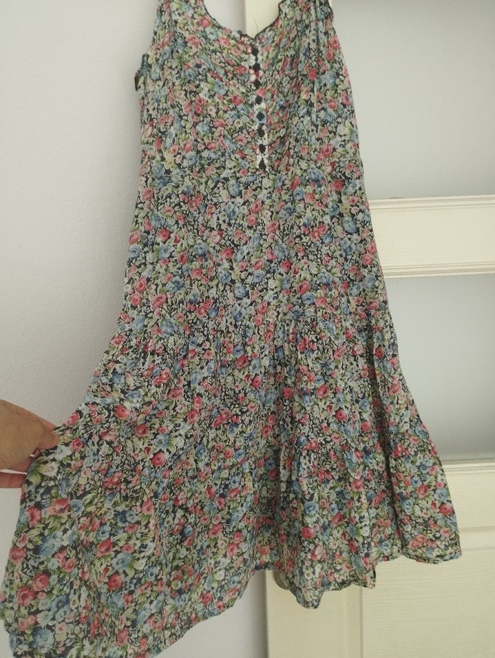 Pamuklu, düğmeli, bol kesim uzun hamile eteği. Pastel çok renkli çiçek desenli, bohem tarzda, günlük kullanıma uygun.