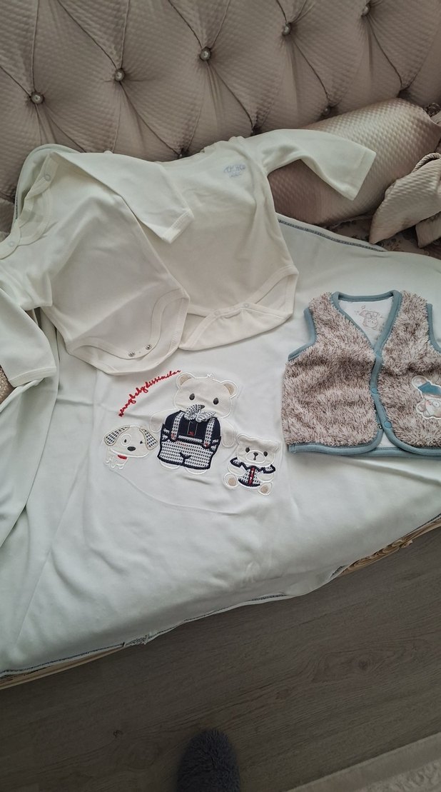 1tane tüylü yelek. 2 tane zıbın 1 i kadife. Bir tane bebek battaniyesi