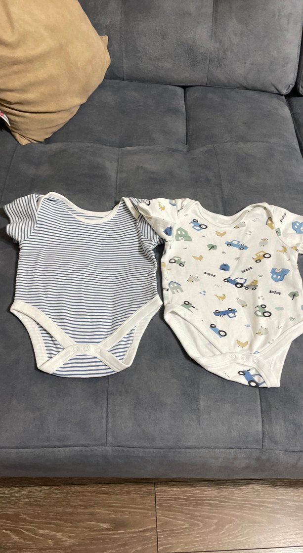 Yumuşak pamuklu kumaştan yapılmış iki kısa kollu erkek bebek body. Biri gri-beyaz çizgili, diğeri renkli araç desenli beyaz. İkisi de yuvarlak yakalı ve örme dokulu.kumaşları pamuk,İngiltere ‘den alınmıştır,sorunu yoktur.6-9 ay için uygundur