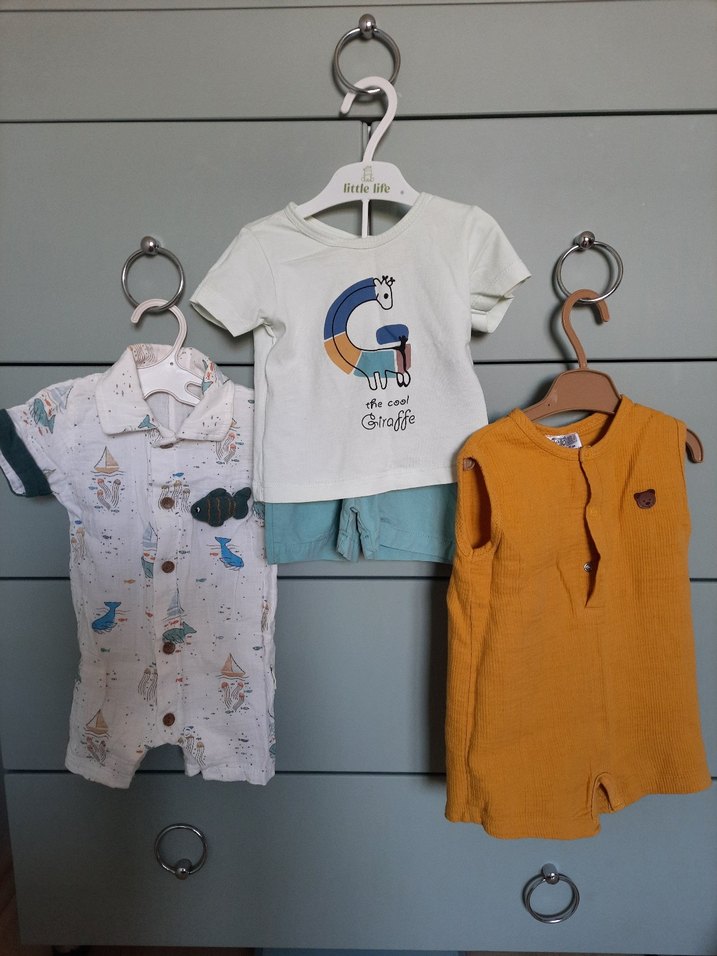 Pamuklu, kısa kollu, düğmeli yaka ve baskılı desenlere sahip erkek bebek tulum seti. Sokak stilini yansıtan, rahat ve şık tasarım. Etiketinde 3-6ay yazıyor, ama 1-3 ay için daha uygundur.