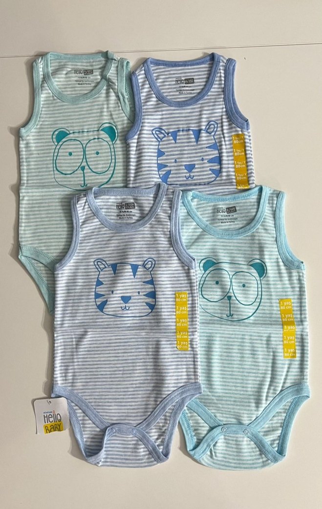 Pastel mavi tonlarda, zebra ve ayı desenli, pamuklu kolsuz erkek bebek body. Yumuşak dokunuşlu örme kumaş, normcore tarzı.