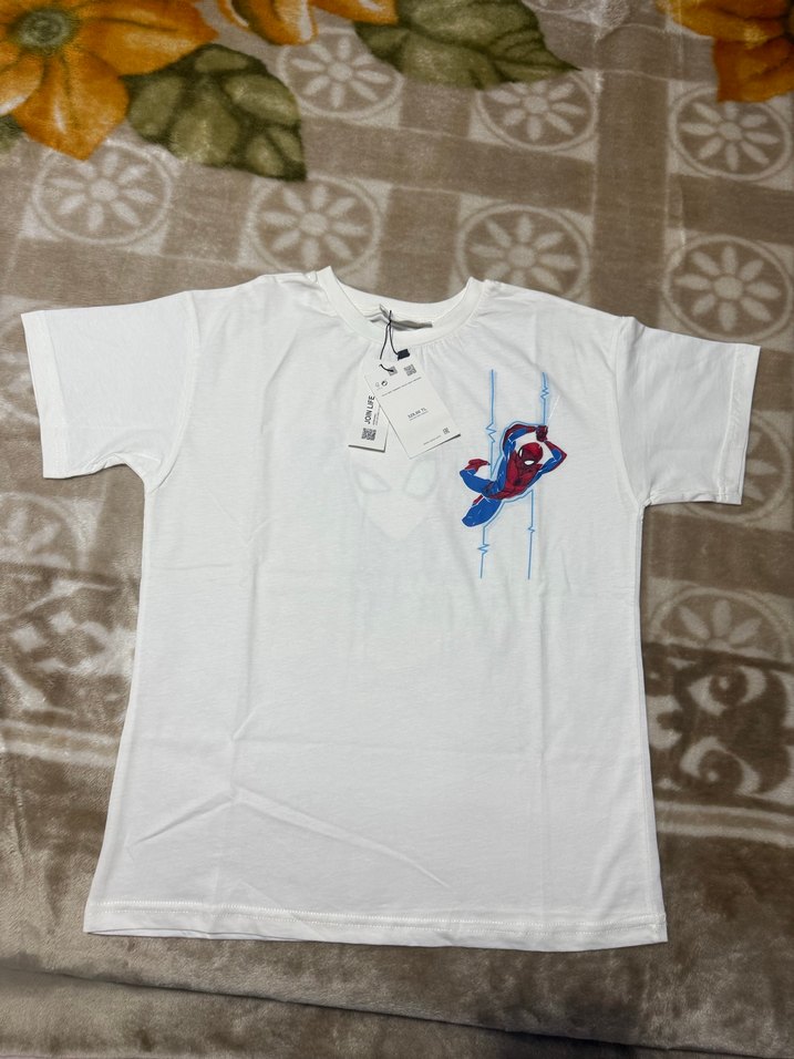 Pamuklu, beyaz renkli erkek çocuk tişörtü, kısa kollu ve bisiklet yaka. Pastel baskı detayına sahiptir. Ölçüleri koltuk altına koltuk altına 46 cm boyu omuzdan itibaren 60 santimetredir . 13 yaştır.