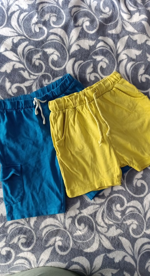 Sarı ve mavi pamuklu, cepli ve lastikli bel detaylı, rahat kesim erkek şort. Renkli ve sade sokak stili için ideal.