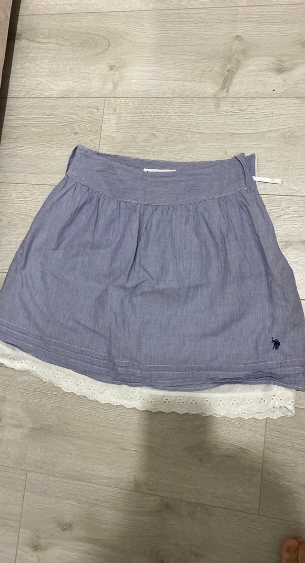 Pamuklu kumaştan, bol kesim ve fırfırlı etek ucu detayına sahip mavi mini etek. Desensiz ve günlük rahat kullanıma uygun.