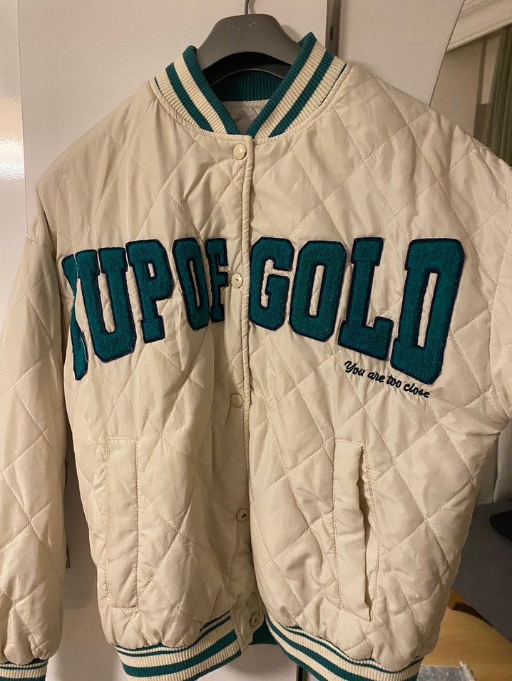 Pamuklu, bol kesim, midi boy, pufflu tasarıma sahip, yuvarlak yakalı ve uzun kollu bu ceket pastel gold renginde, yeşil çizgili ribana detaylıdır. Önünde "UPFGOLD" ve "You are too close" nakışları bulunur.