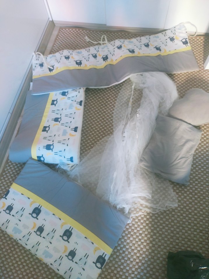 Pamuklu kumaştan gri baskılı yastıklar ve yumuşak tül cibinlik içeren bebek uyku seti, konfor ve koruma sağlar. ️,yatak koruyucu suda var, defo leke yırtık yoktur ,temiz ürün ,ölçüleri resimlerde mevcuttur