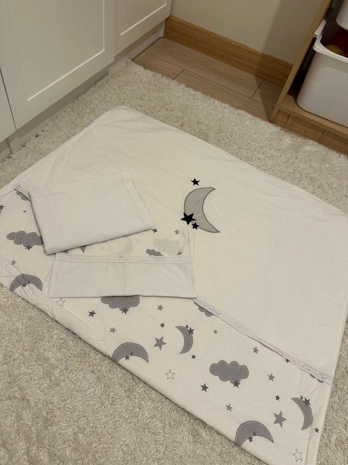 Pamuklu, beyaz zemin üzerine gri ay, yıldız ve bulut desenleriyle çocuk uyku seti. Battaniye ve uyku yastığı içerir.