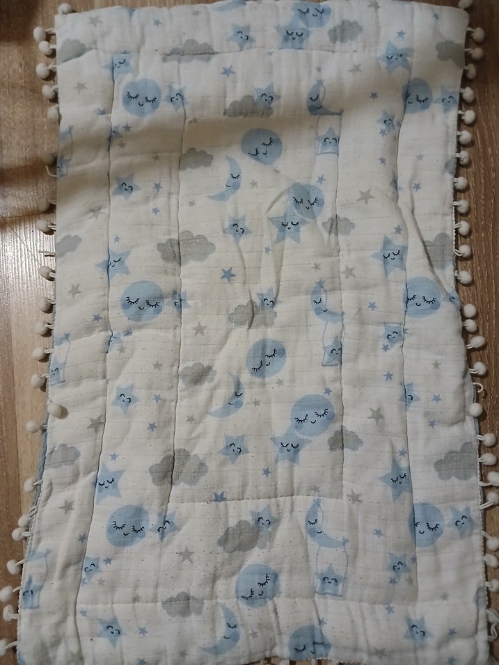 Kenarları küçük ponponlu, gri ve beyaz bulut ile ay desenli yumuşak pamuklu bebek alt değiştirme örtüsü yastığı da mevcut yastıkla beraber gönderim yapılacaktır