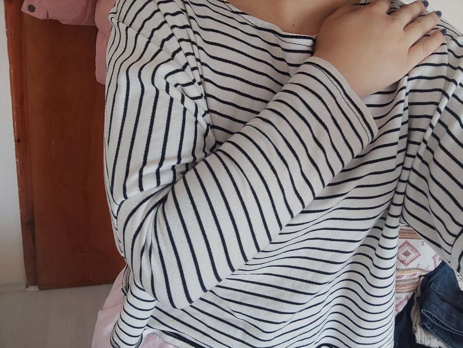 Pamuklu, uzun kollu, salaş kesim hamile tişörtü. Crew neck, pliseli detaylar ve çizgili deseniyle gündelik kullanım için uygun.