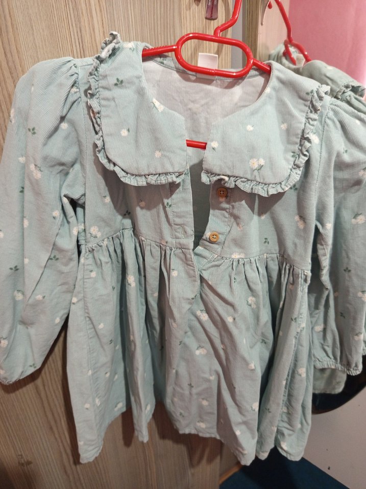 Gri pamuklu kız çocuk elbisesi, uzun kollu, yakalı ve düğmeli. Bol kesim ve nakışlı desenlerle bohem tarzda.