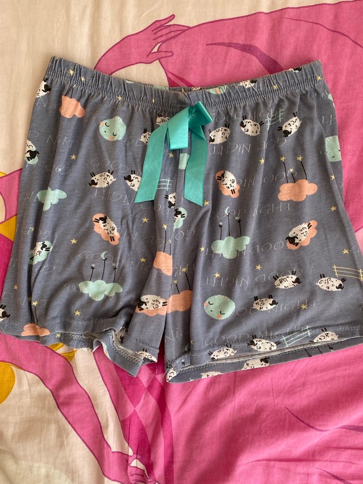 Yumuşak pamuktan, bol kesim, bulut ve koyun desenli, belde ayarlanabilir turkuaz kurdeleli gri mini şort.Rahat sokak stili için uygun. ☁️