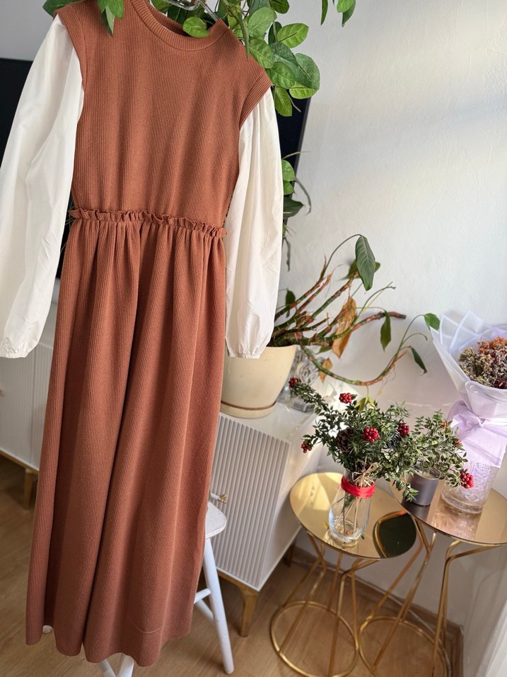 Kahverengi, pamuklu uzun elbise bol kesim ve drapeli tasarıma sahip. Beyaz uzun kollu gömlek ile kombinlenmiş, yuvarlak yakalı, modern klasik ve bohem tarzda günlük kullanıma uygun.