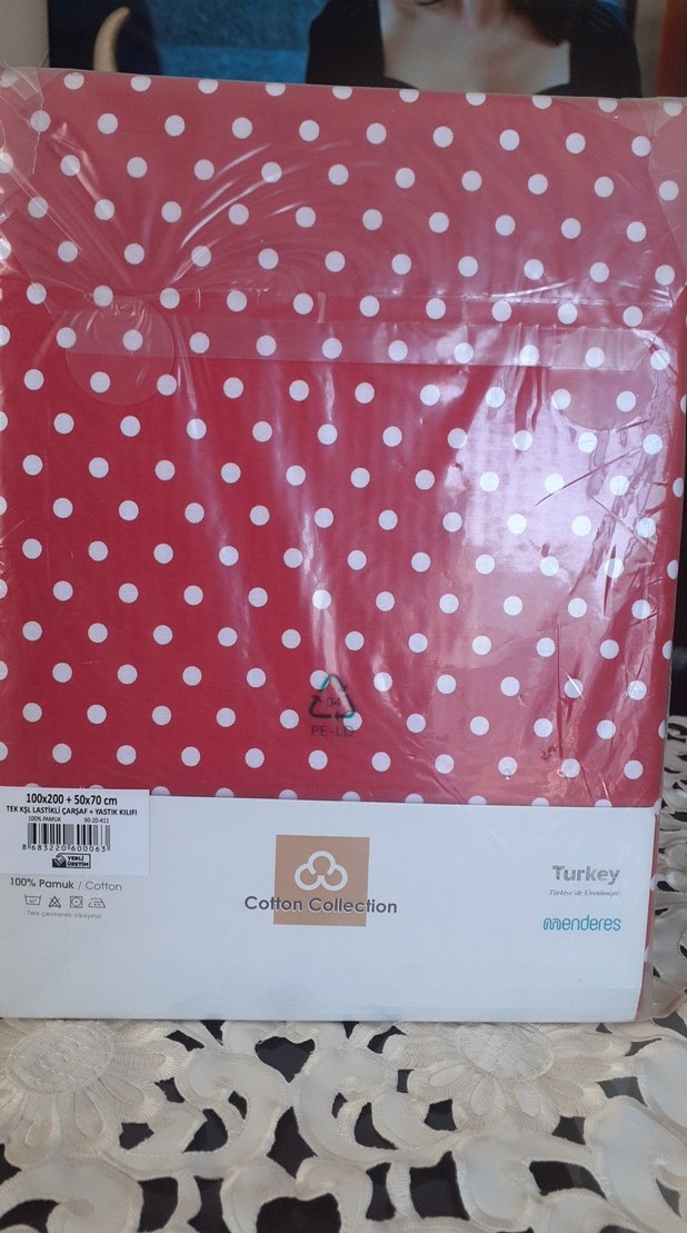 Açık kırmızı renkte beyaz puantiyeli baskılı nevresim ve çarşaf takımı. %100 pamuktan, yumuşak ve şık... KESINLIKLE BOYAMA ÇEKME YAPMAZ. ebad 100x200 CM LASTIKLI ÇARŞAF, 50X70CM yastık kılıfı...