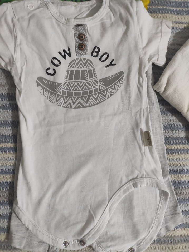 Beyaz renkli, kısa kollu ve yuvarlak yaka pamuklu erkek bebek body. Önünde baskılı kovboy şapkası ve düğme detayları bulunur.