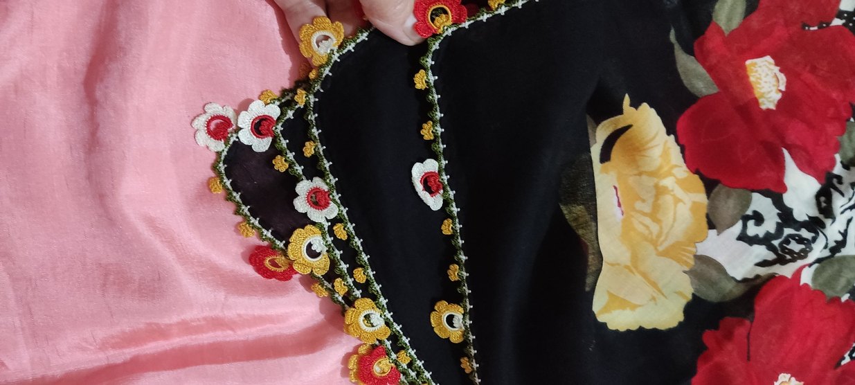 Kadın fuları, örgü kumaş üzerine çok renkli çiçek nakışı ve zincir detaylarıyla bohem tarzını yansıtıyor.