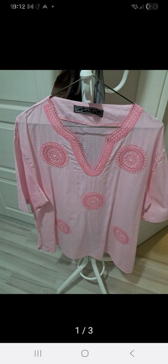 Pamuklu kumaştan, V yaka, kısa kollu, nakışlı ve dantel detaylı bol kesim pudra pembe bohem bluz. Günlük kullanım için uygundur.