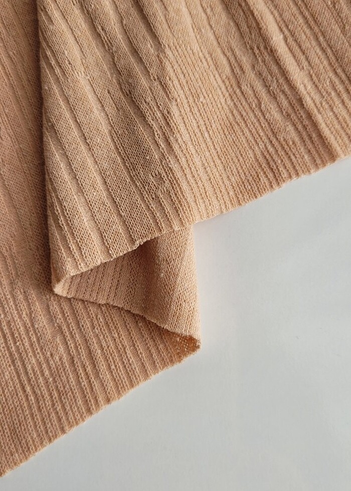 Pamuklu likralı ince triko kumaştır.Kendinden desenlidir, yumuşak ve dökümlüdür ,ince ama tok bir örme kumaştır.Hırka , kazak ,badi ,tunik , etek , elbise vb dikilebilir.Eni 150 cm , boyu 185 cm.Tamamı 200 tl.