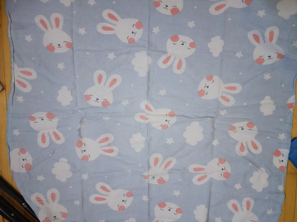 Pastel mavi renkte, pamuklu kumaştan yapılmış, sevimli tavşan ve bulut desenli çocuk battaniyesi.