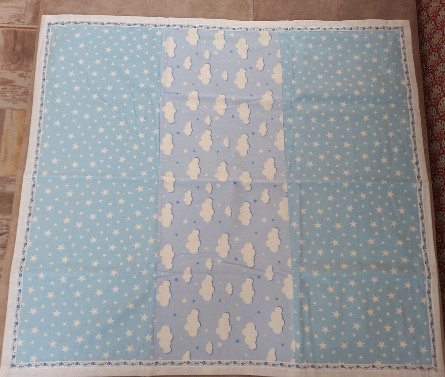 Yumuşak pamuklu kumaştan yapılmış, pastel mavi renkte ve bulut ile yıldız desenli çocuk nevresim takımıdır. el yapımı.
