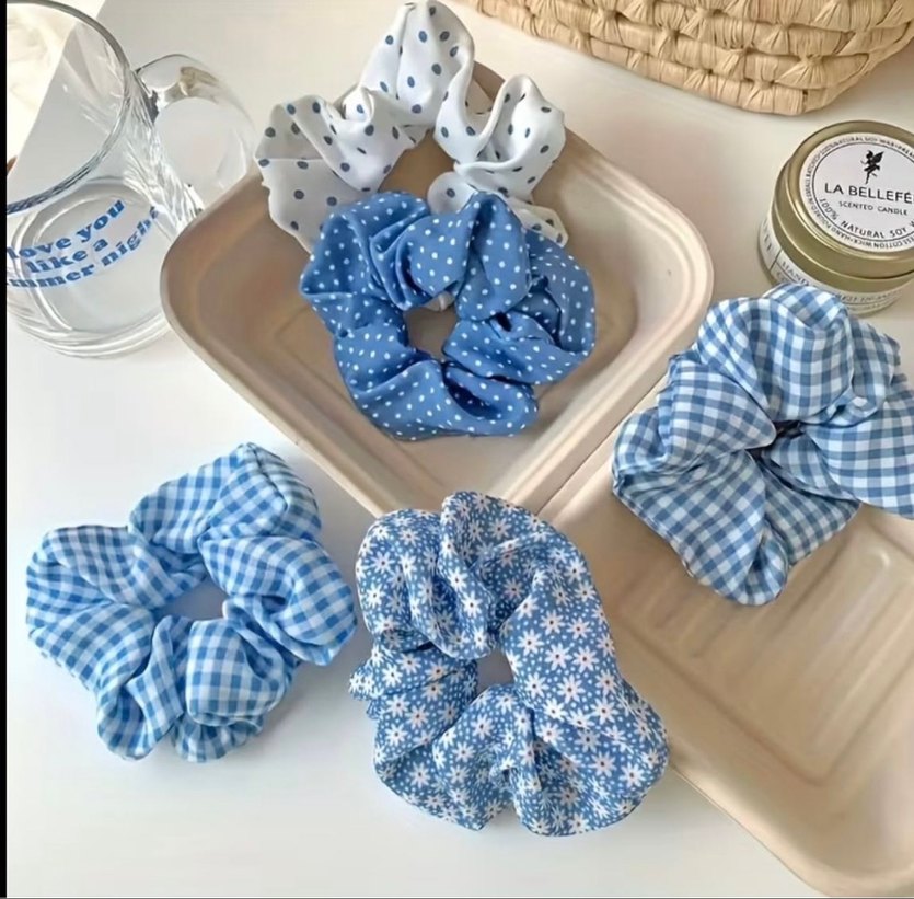 Pamuklu, elastik mavi saç tokası seti; puantiye, kareli ve çiçekli desenlerle bohem tarzı tamamlar. 5 adet fiyatıdır