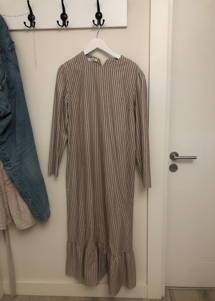 Çok rahat her mevsim giyilebilecek bir elbise çok sıcak olmadığı sürece yazın çok soğuk olmadığı sürece kışın da giyiliyor (markasını tam olarak bilmiyorum bilmiyorum ama Sefa Merve'den almıştım sanırım) beden 52 yazıyor ama düz kesim 48 50 için daha iyi olur diye düşünüyorum