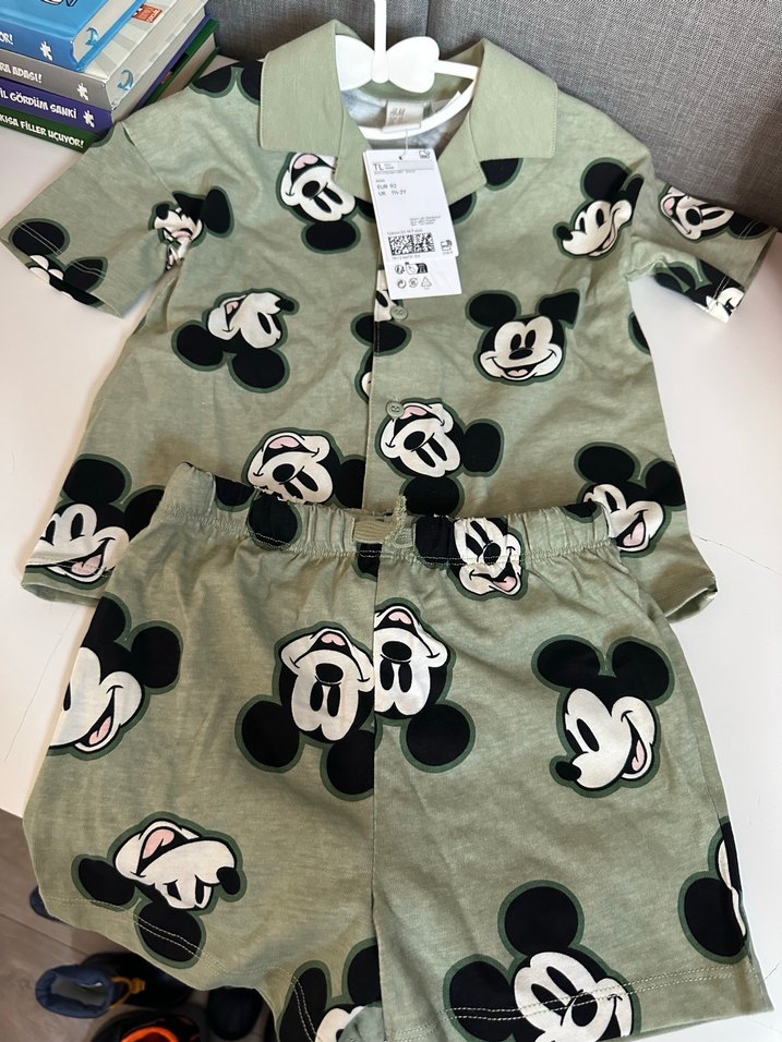 Pamuklu kumaştan yapılmış, kısa kollu, düğmeli ve notched lapel yakalı gri renkli Mickey Mouse baskılı bebek takımı. 1/5 2 yaş