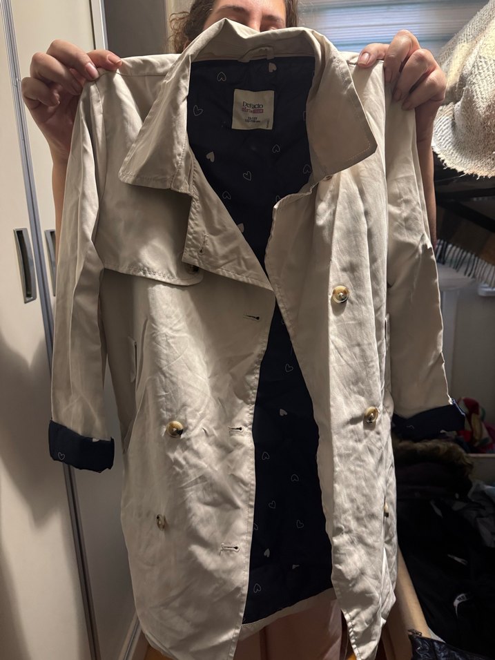 Pamuklu, düğmeli, uzun kollu midi beyaz trençkot. Gri astarlı, rahat kesim, notlu yaka detayı ile günlük kullanım için uygundur.