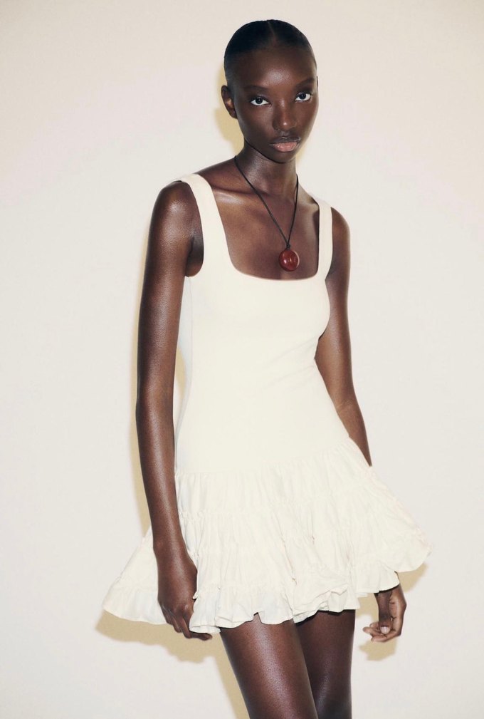 Düz beyaz pamuklu mini elbise, düz yaka ve kolsuz tasarıma sahip, etek kısmı volanlıdır. Minimalist şıklık için uygundur.