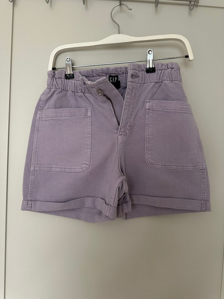 Yumuşak pamuklu kumaştan, kemerli ve büyük ön cepli bol kesim mini şort. Rahat sokak stili, mor tonlarında. hiç kullanılmamıştır
