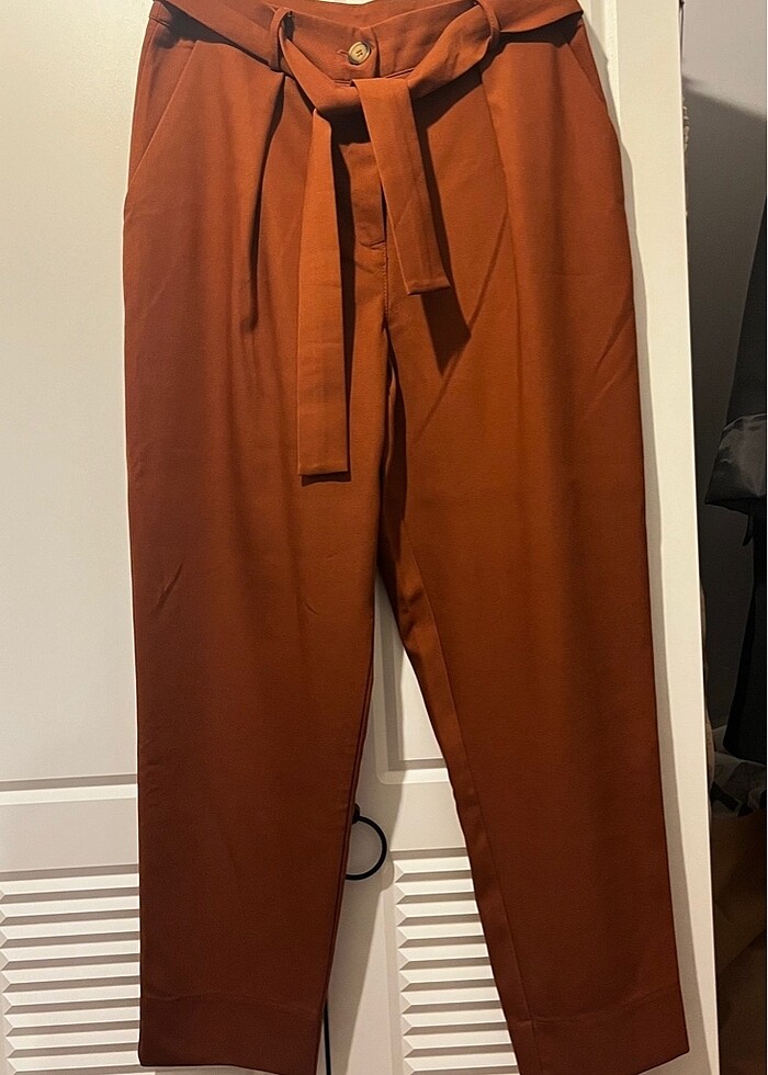 Kremit rengi beli kemerli kumaşı pamuklu yeni rahat kalıp pantolon