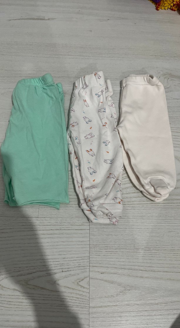Beyaz, krem ve açık yeşil pastel tonlarda, pamuklu üçlü bebek alt pijama seti. Birinde hafif hayvan desenleri vardır.