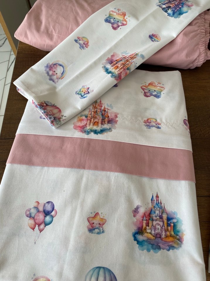 Pamuklu kumaştan yapılmış, pembe tonlarda, baskılı çocuk uyku seti. Kale, balon ve yıldız desenleriyle süslenmiştir. Tek kişilik