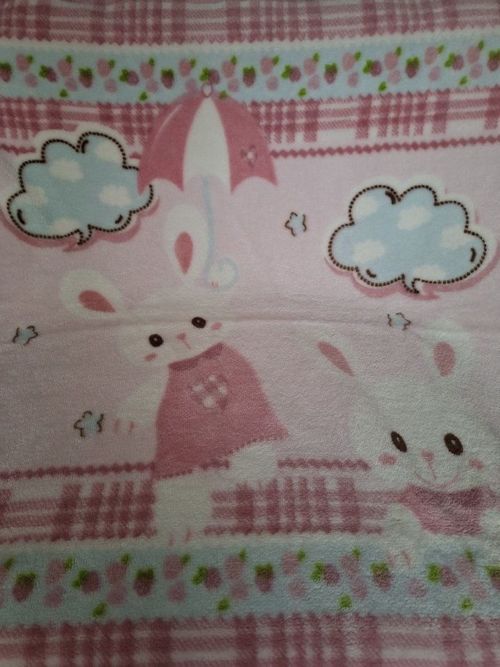 Yumuşak pamuk kumaştan yapılmış, pembe renkte, tavşan, bulut ve şemsiye baskılı çocuk uyku tekstili battaniye