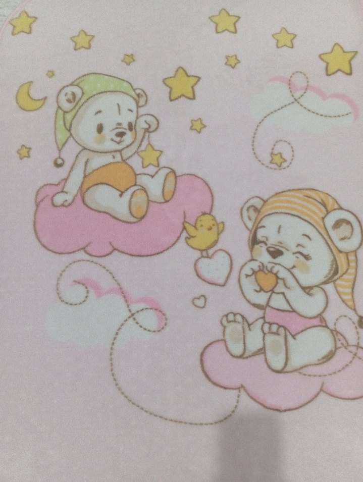Pamuklu, pembe renkli çocuk battaniyesi, pastel tonlarda bulutlar üzerinde sevimli ayıcık desenleri içerir. Yumuşak ve rahat bir kullanıma sahiptir. Çift taraflı