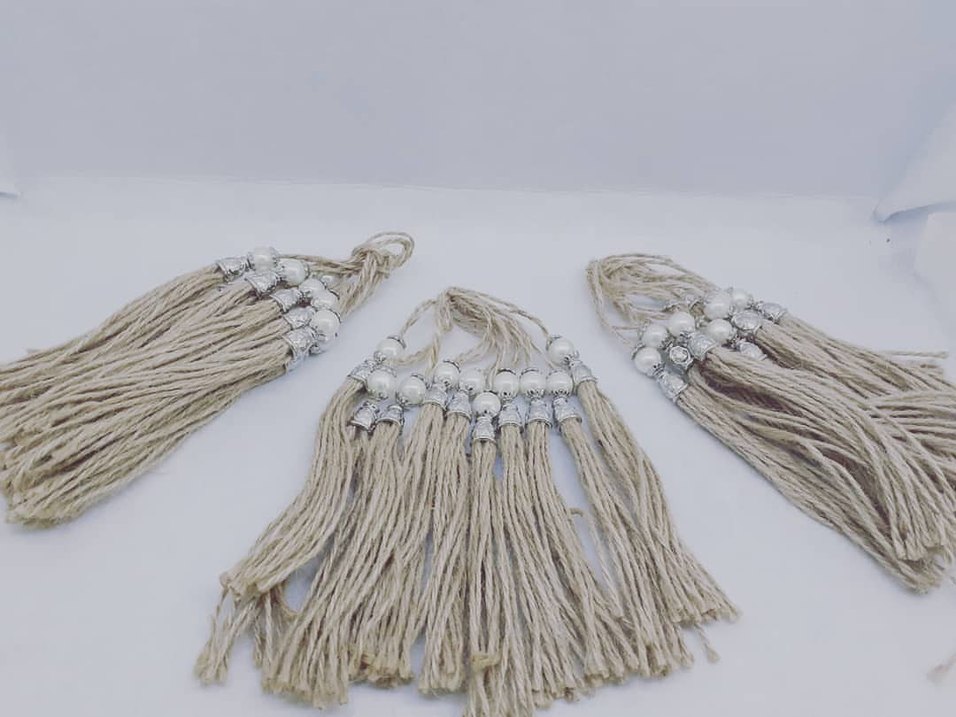 Bej pamuklu püsküller ve boncuklarla süslenmiş bohem tarz saç aksesuarı. Retro ve hippie görünüm için ideal.