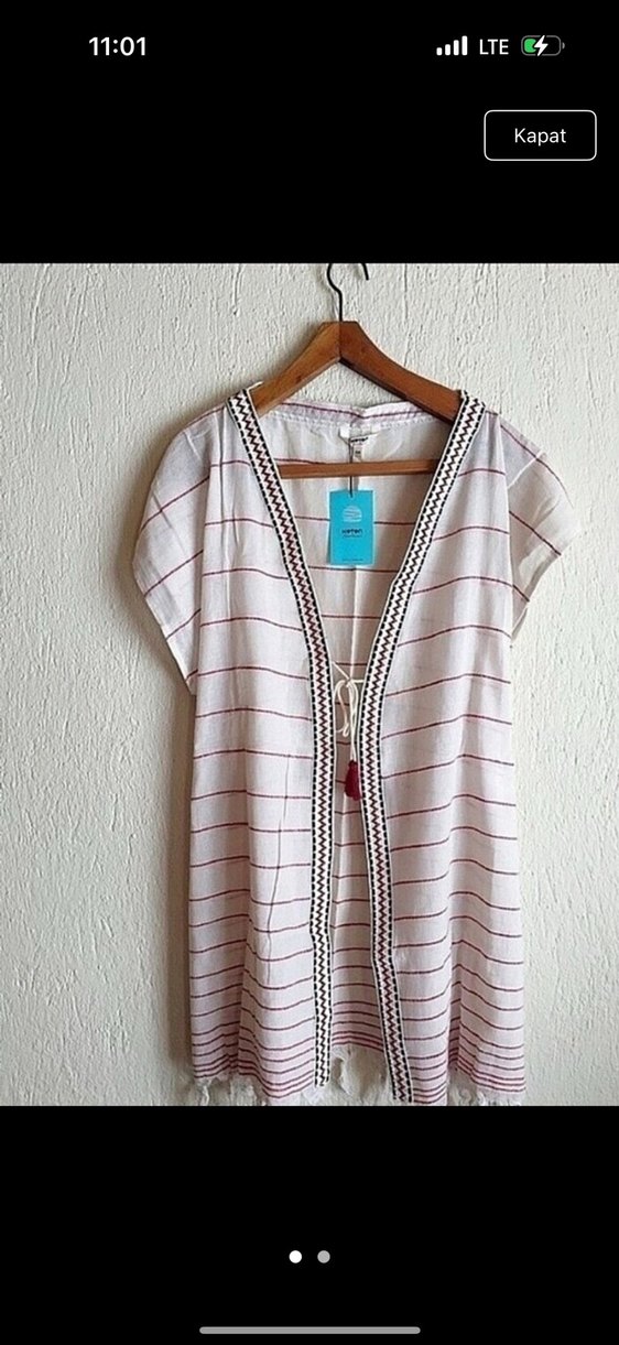 Pamuklu, uzun ve bol kesim pareo, kısa kollu ve V yakalıdır. Hafif batik desenli ve püsküllü detaylara sahiptir, bohem tarz için uygundur.