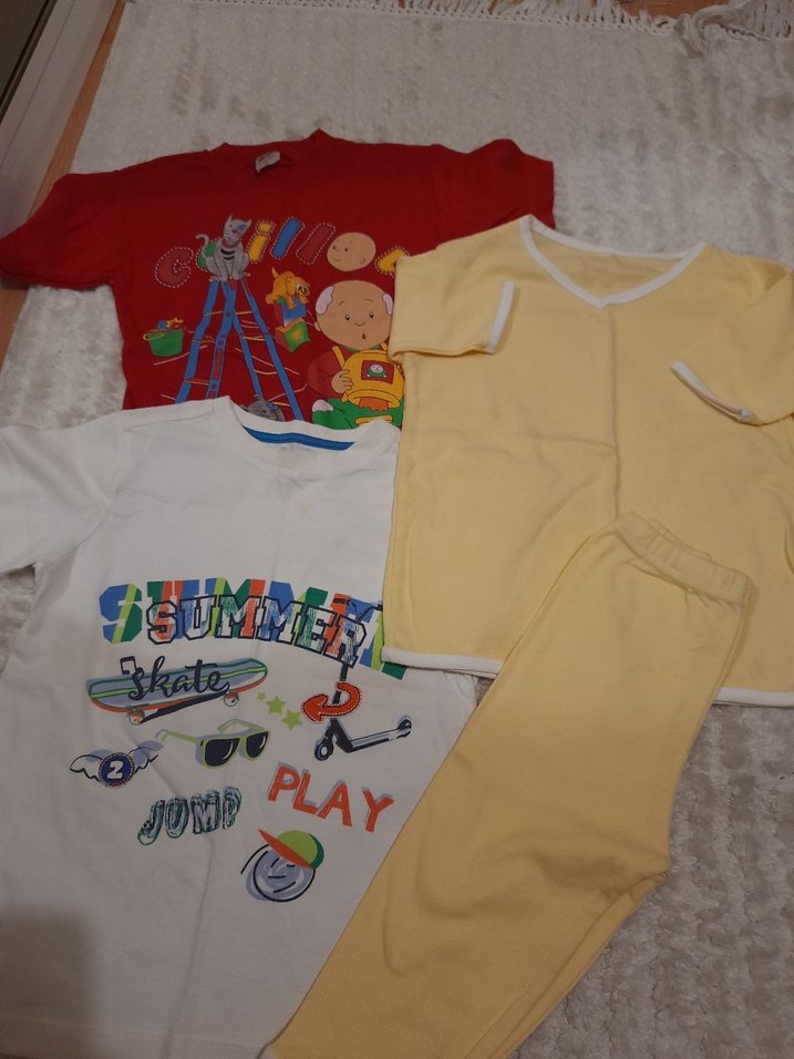 Pamuklu, sarı pijama takımı ve yaz, kaykay temalı renkli baskılı çocuk tişörtleri içerir. beyaz tshirt az kullanıldı diğerleri yeni,toplu fiyatıdır