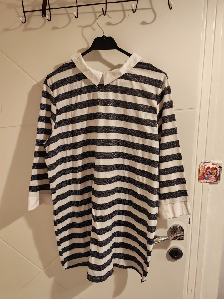 Pamuklu, siyah beyaz çizgili, uzun kollu, yakalı ve düğmeli manşetli rahat kesim kadın gömleği. Sokak stili için midi boyda uygun.