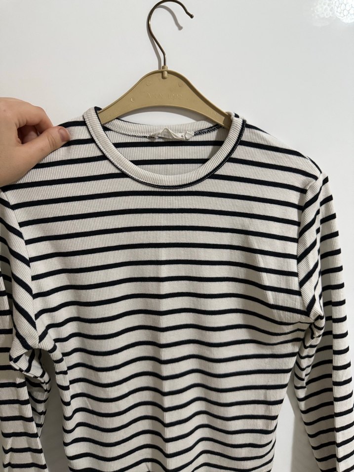 Pamuklu kumaştan, siyah beyaz çizgili, uzun kollu ve bisiklet yaka, vücuda oturan rahat bir kazak. Günlük kullanıma uygun şık ve rahat bir parça.