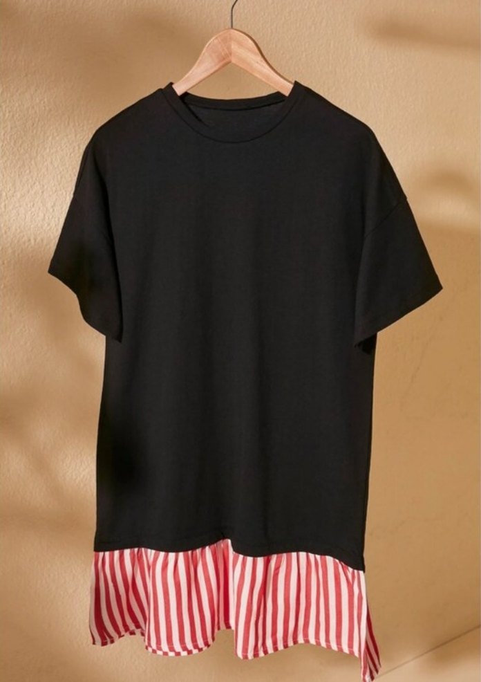 Pamuklu Siyah Çizgili Mini Elbise-Tunik