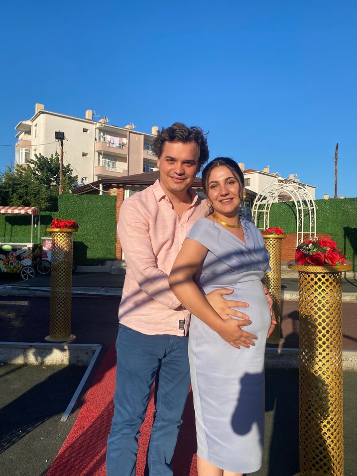Pamuklu, pastel camel renkli, straplez yaka ve balon kısa kollu hamile elbisesi. Normal kesim ve midi boydadır, düğün ve günlük sokak stili için uygundur.