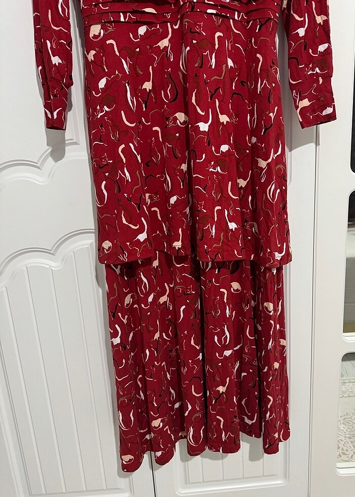 Bi iki kez kullanıldı orjinal hugoboss markadır bütün detaylar görselde göründüğü gibidir yenidir belden oturmalı iki kat elbise belde kemer görünümlü pile vardır resimde cok belli olmuyor ama cok şık bi elbisedir Omuzdan boy 128 cm Kol boyu 56 cm tercih eden kollarını kısalta bilir Bel 39cm Yaka acıklık 20cm