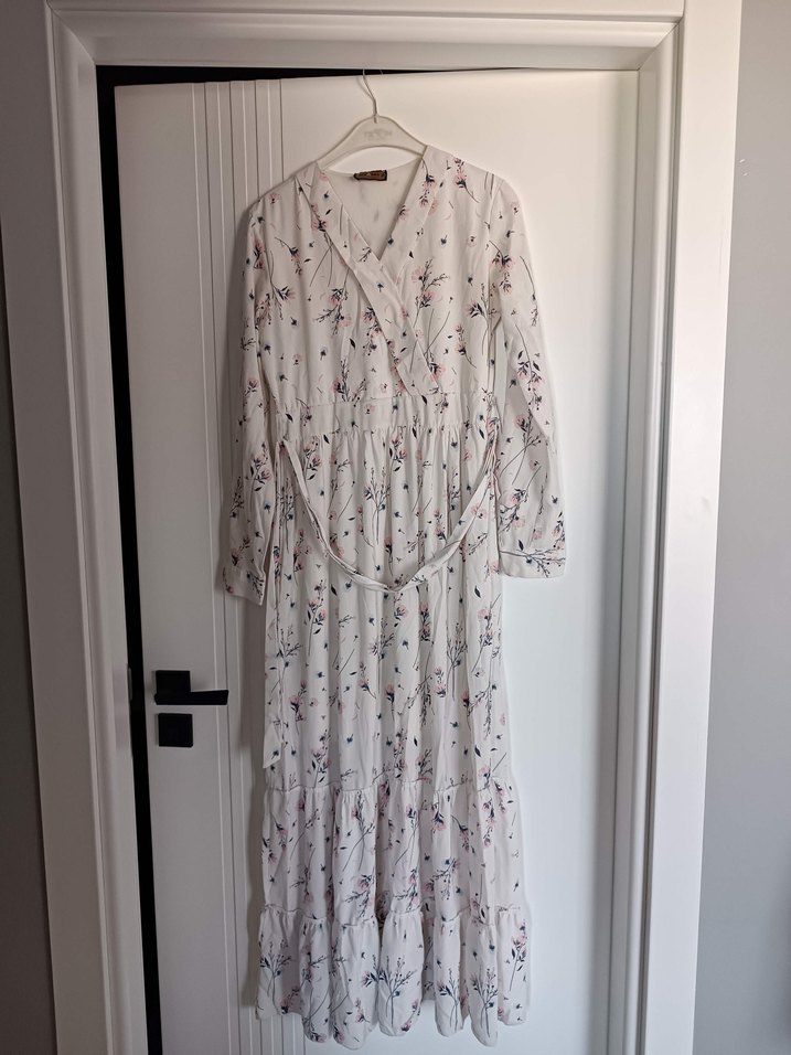 Pamuklu, uzun beyaz elbise, bol kesim ve V yaka ile. Pastel çiçek desenli, drapeli ve askılı kolları günlük kullanıma uygun.