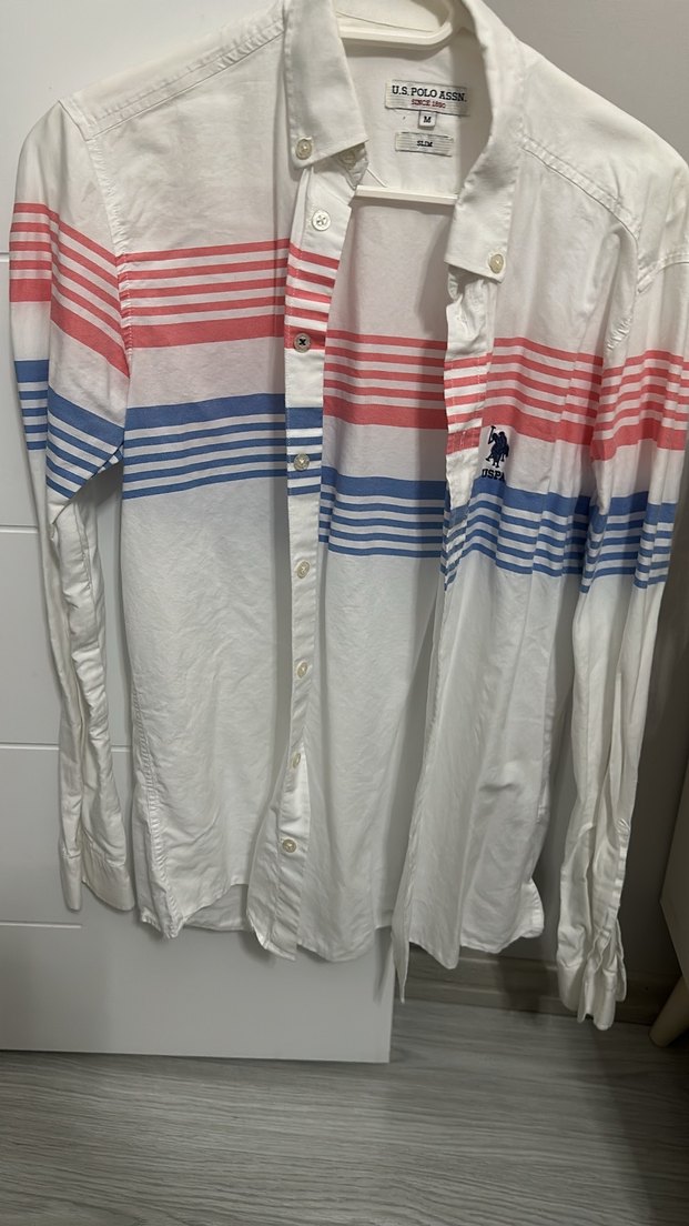 Pamuklu kumaştan üretilmiş, uzun kollu ve düğmeli, yakalı erkek gömleği. Beyaz üzerine kırmızı ve mavi baskılı çizgilerle, rahat kesimli ve günlük kullanım için uygun.