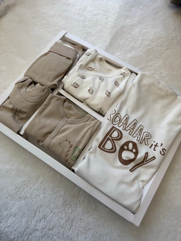Pamuklu, uzun kollu ve bohem tarzda bebek erkek takımı. Camel ve krem renklerde, baskılı desenlerle rahat ve şık bir set. 10lu Hastane Çıkışı