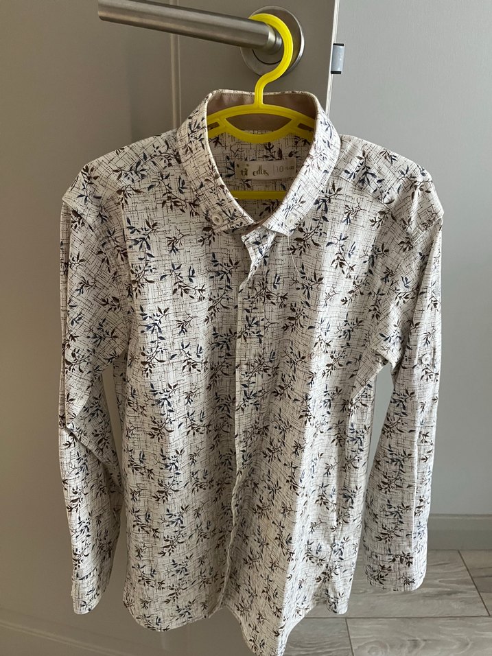 Pamuklu, uzun kollu, düğmeli, yakalı ve desenli gömlek. Yaka ve kol manşet detaylarıyla şık bir gömlek